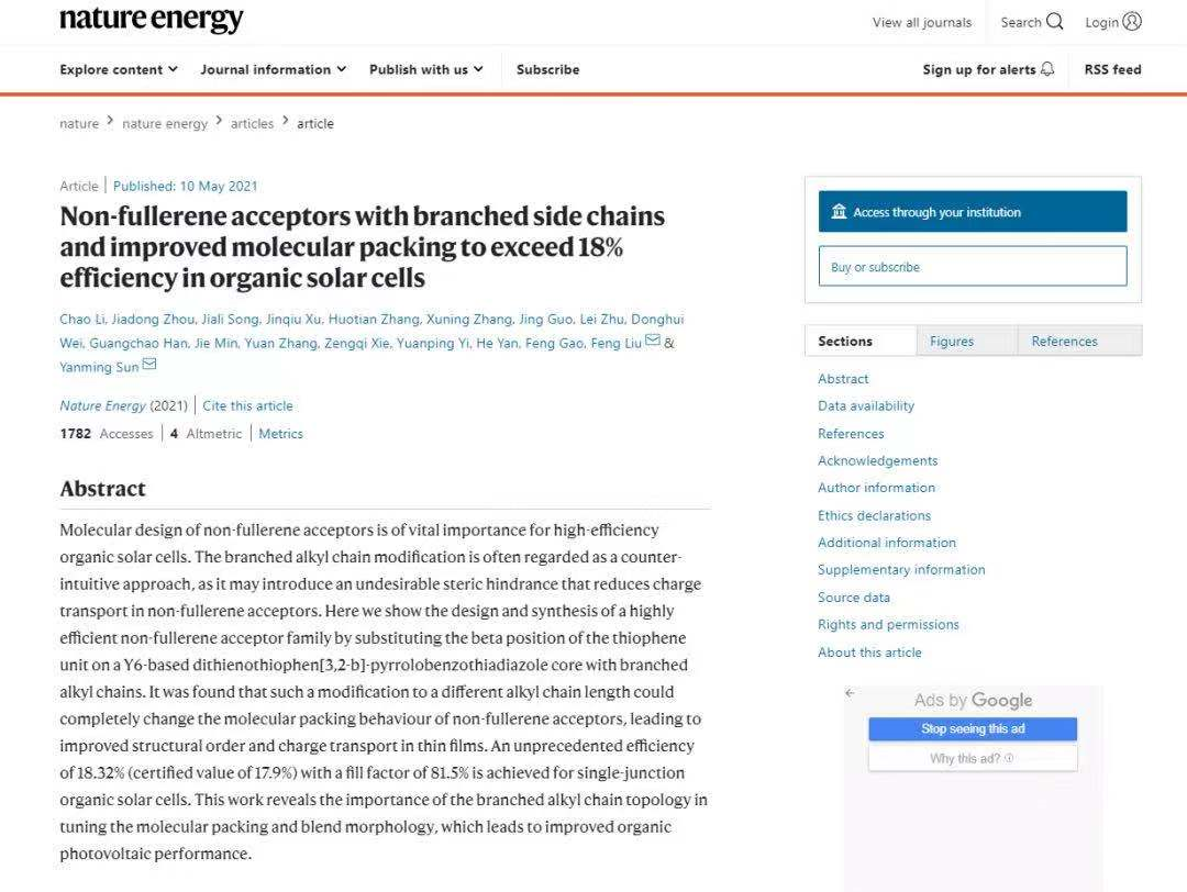北航新闻网5月11日电(通讯员 孙艳明)2021年5月10日,《Nature Energy》杂志以在线全文Article的形式发表了北京航空航天大学化学学院孙艳明教授课题组与上海交通大学刘烽教授课题组在有机太阳能电池领域的最新研究成果“Non-fullerene acceptors with branched side chains and improved molecular packing to exceed 18% efficiency in organic solar cells”。北航李超博士和华南理工大学周家东博士为第一作者,孙艳明教授和刘烽教授为通讯作者,北京航空航天大学化学学院为第一完成单位。