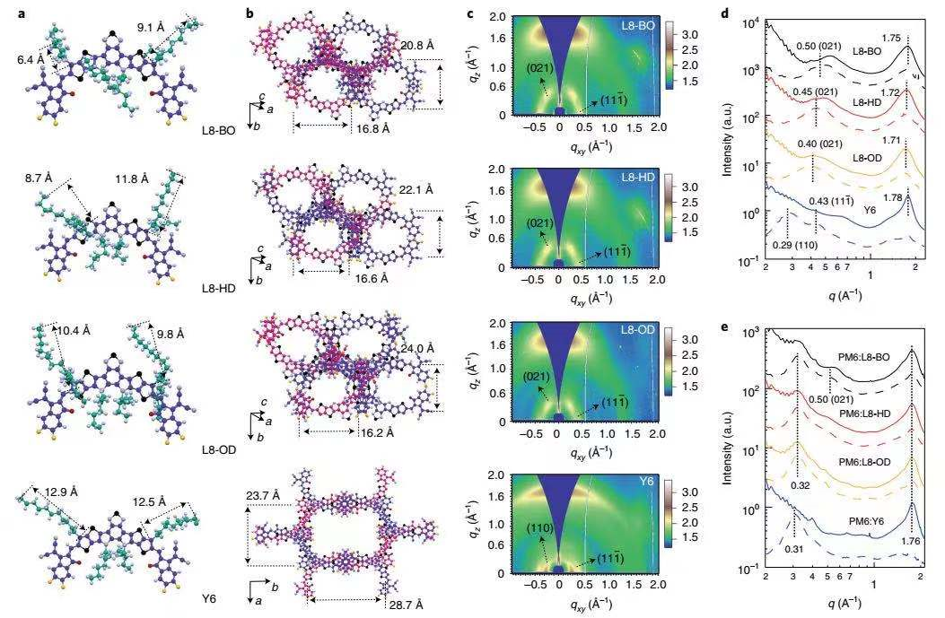 图2. L8-R和Y6单晶堆积以及薄膜X射线散射图。